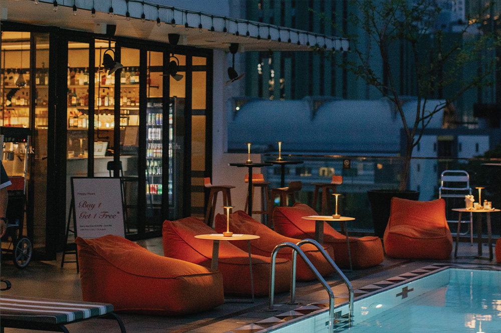 The Drink Rooftop Bar offers both indoor and outdoor seating with a cozy poolside setting. Guests can sip their favorite drinks while soaking in Bangkok’s glittering skyline — a truly unique rooftop experience in the Pratunam area.